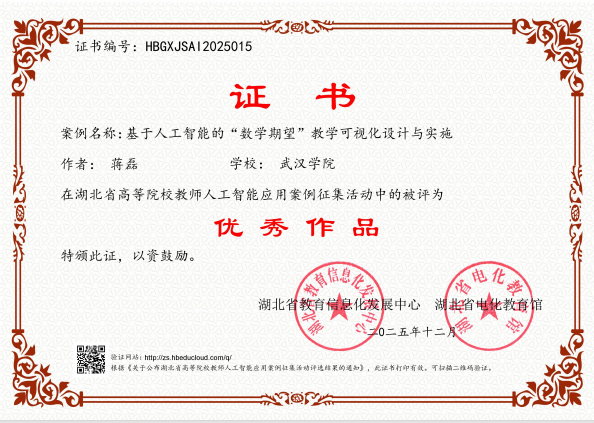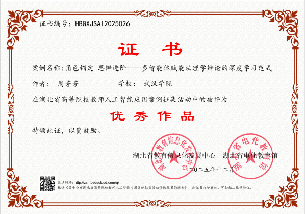 本次省级案例征集活动由湖北省教育信息化发展中心(湖北省电化教育馆)统筹开展,根据教育部相关工作要求,经学校择优推荐、专家集中评审等环节,最终遴选出 50 项优秀作品。其中,蒋磊老师的《基于人工智能的“数学期望”教学可视化设计与实施》,巧妙借助人工智能技术破解抽象数学概念的教学难点,形成“AI生成内容+教师主导设计+可视化实验”的可复制理科教学新模式;周芳芳老师的《角色锚定思辨进阶——多智能体赋能法理学辩论的深度学习范式》,基于真实的课堂辩论数据,聚焦法学理论课程中抽象思辨难导入、学生参与度低的核心痛点,借助多智能体技术构建沉浸式辩论场景,有效提升了学生的思辨能力与深度学习效果。两项案例均生动展现了我校在“人工智能 + 教育”领域的探索成果与实践水平。