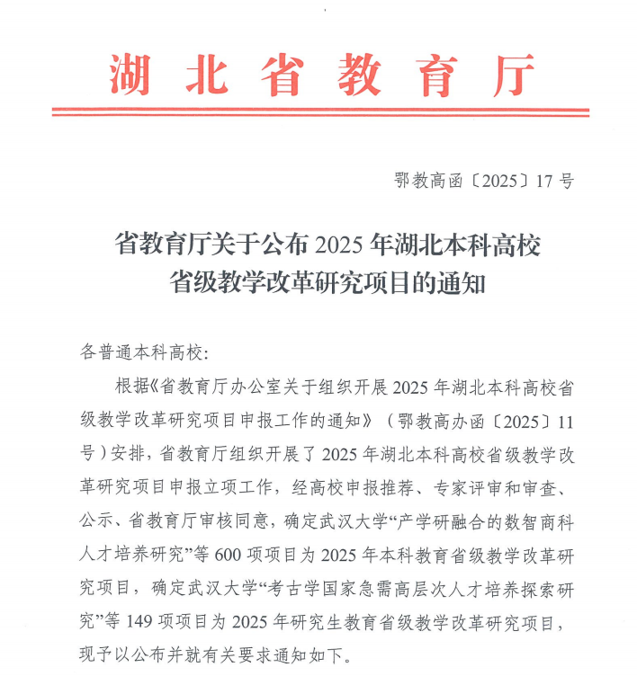 近日,湖北省教育厅公布了2025年湖北本科高校省级教学改革研究项目,我校5个项目获批省级项目立项(含委托项目2项)。