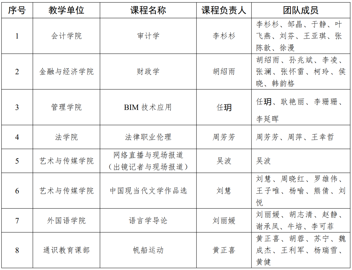 根据学校《关于开展2025年校级本科课程思政示范项目申报工作的通知》要求,经教师申报、学院(部)推荐、教务处审核、组织校外专家评审、校教指委审议,拟确定《审计学》等8门课程立项为2025年校级本科课程思政示范项目。