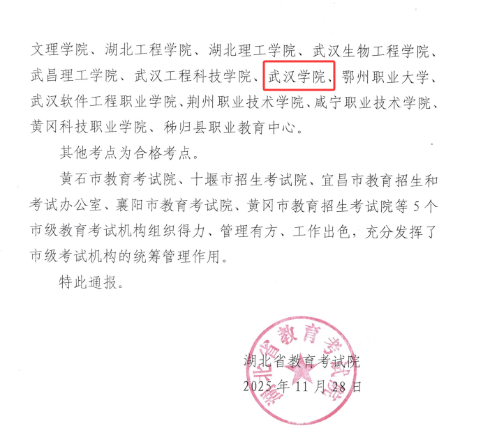 “优秀考点”称号的获得,是对武汉学院长期以来严谨组织国家级考试、持续优化考务管理能力的肯定。学校未来将继续推进考试信息化、规范化建设,不断提升考务服务质量,为考生营造更加公平、安全、有序的考试环境。
