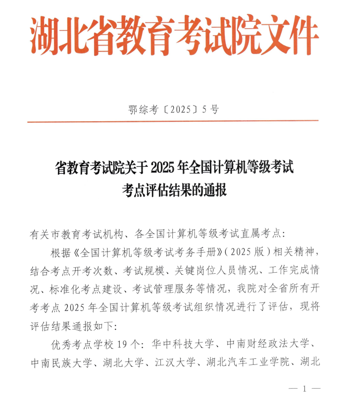 近日,湖北省教育考试院公布2025年全国计算机等级考试考点评估结果,全省共有19所院校被评为“优秀考点”,武汉学院名列其中。此次评选充分体现了学校在考试组织、技术应用及规范管理方面的突出成效。