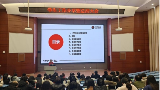 育人线深入领会,推动法治理念入心。 2025年1月7日下午,全体学工战线教职工开展集体学习。系统梳理《学位法》立法脉络与施行意义,阐明其作为学位制度根本法治保障的重要地位。会议要求学工队伍先学一步、深学一层,并主动将法治精神融入学生日常教育、管理与服务,做好面向学生的宣讲与引导。
