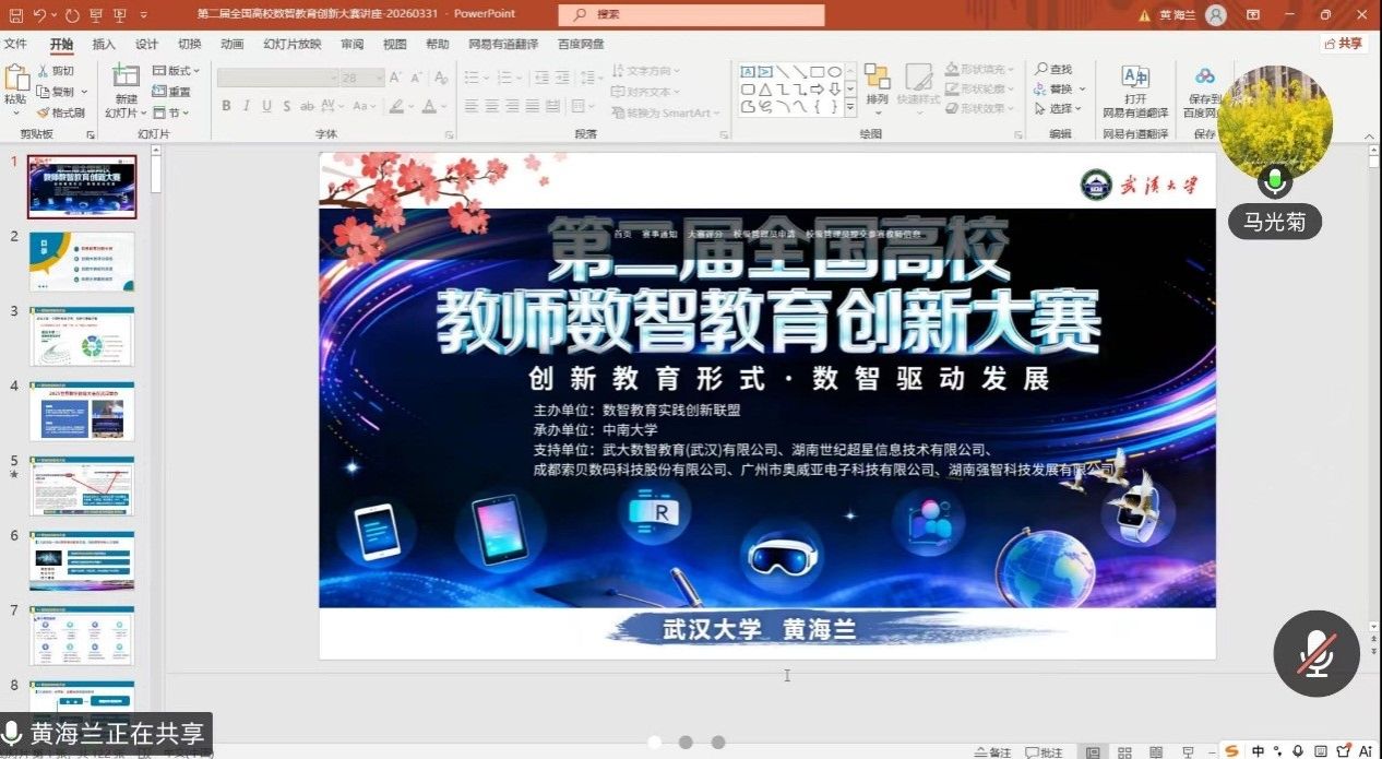 为深入推进数字技术与教育教学深度融合,切实提升我校教师数智教育创新能力,助力教师高效备战第二届全国高校教师数智教育创新大赛,3月31日晚,教务处组织召开了线上专题培训会。本次培训特邀武汉大学黄海兰教授指导授课,我校5个拟参赛团队及相关教师齐聚线上、认真参会,会议由教务处副处长马光菊主持。
