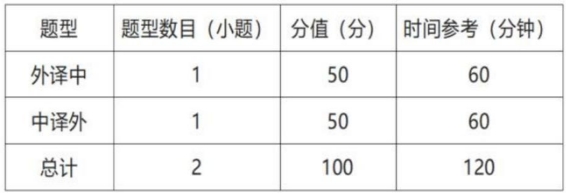 满分为100分,时间为120分钟,共2种题型2道题,全部为主观题。参赛选手可使用中译外、外译中纸质版词典各1本。