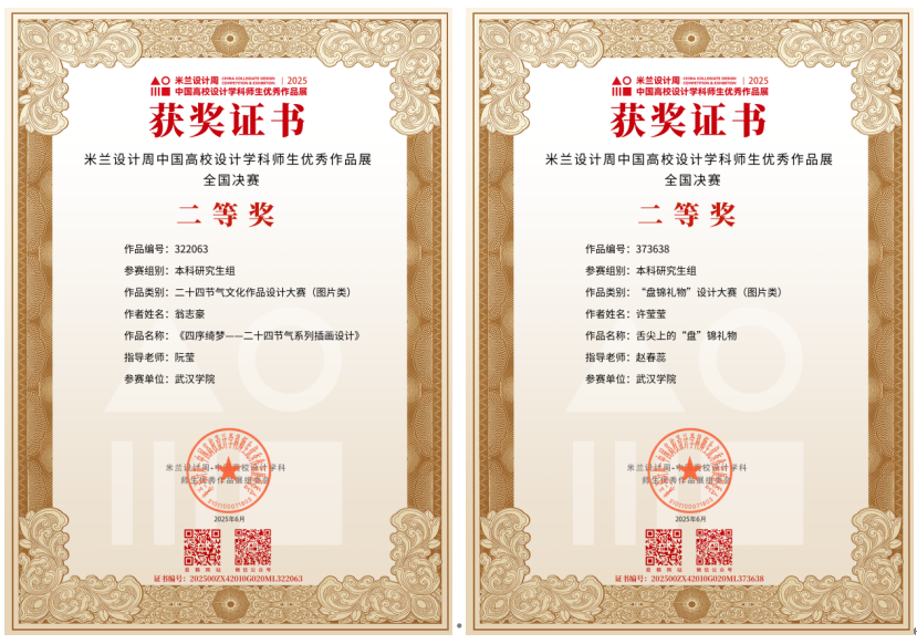 近日,武汉学院师生们在2025米兰设计周-中国高校设计学科师生优秀作品展中取得了优异成绩,共斩获21项大奖,其中命题赛道国家级二等奖2项。非命题赛道国家级二等奖1项,三等奖3项;省级一等奖1项,二等奖8项,三等奖6项。