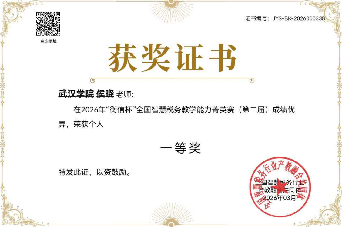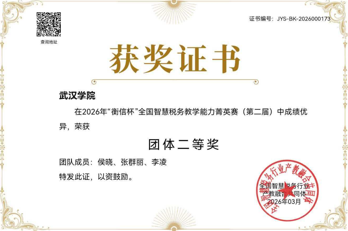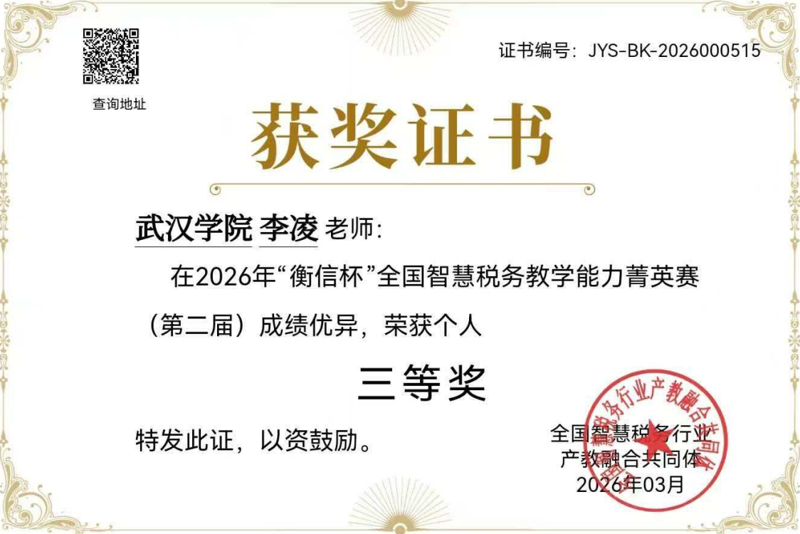 近日,2026年“衡信杯”全国智慧税务教学能力菁英赛(第二届)圆满落幕,武汉学院金融与经济学院财税系参赛教师侯晓、张群丽、李凌表现优秀,从全国800余所院校的2000余名参赛选手中脱颖而出,斩获个人总分奖一等奖1项、二等奖1项、三等奖1项,并凭借团队整体优异表现荣获团队二等奖,实现了个人荣誉与集体荣誉的双丰收,充分展现了我校财税专业教师扎实的专业功底与卓越的教学实践能力。