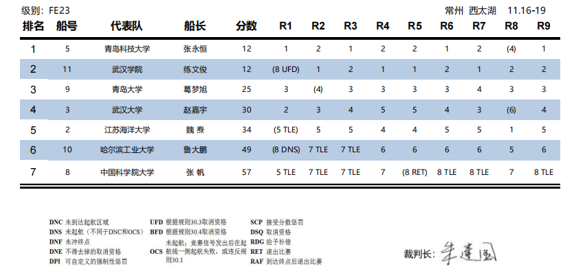 最后一天迎来了比赛的决胜环节。面对来自各大高水平的优秀船队,武汉学院帆船队秉持着“明德创新,解行并进”的校训理念,在面对往届的王牌劲旅时,展现出毫不畏惧的姿态,越战越勇。在不断变化的形势下,队员们始终保持冷静、不骄不躁、永不放弃,通过默契的团队协作,最终武汉学院帆船队与青岛科技大学帆船队战成平局。经过四天的激烈竞争,武汉学院帆船队最终获得全国大学生帆船联赛总决赛的亚军,为我校赢得了荣耀。同时,我校胡蓉老师荣获“优秀教练员”称号,徐金航同学被评为“优秀运动员”。